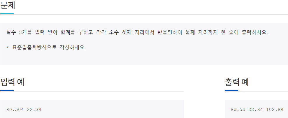 #include <iostream> using namespace std; int main() { double a, b; cin >> a >> b; cout.setf(ios::fixed); cout.precision(2); cout << a << ' ' << b << ' ' << a + b << endl; }206 : 파일입출력 - 형성평가2