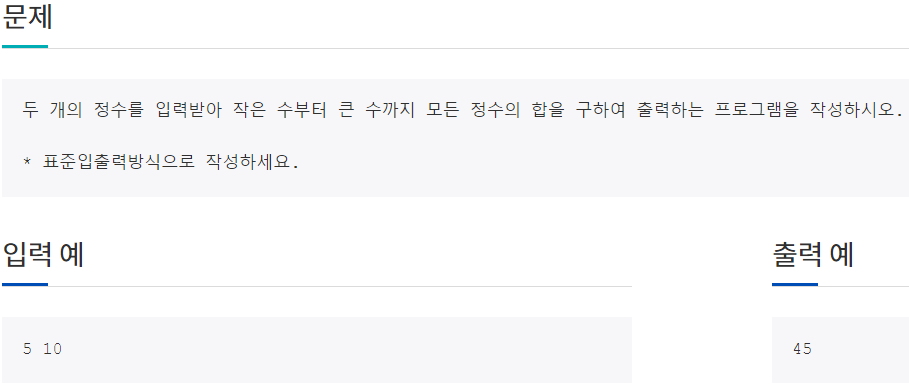 #include <iostream> using namespace std; int main() { int a, b; cin >> a >> b; int beg = (a < b) ? a : b; int end = (a > b) ? a : b; int sum = 0; for (; beg <= end; sum += beg++); cout << sum << endl; }627 : 파일입출력 - 자가진단2