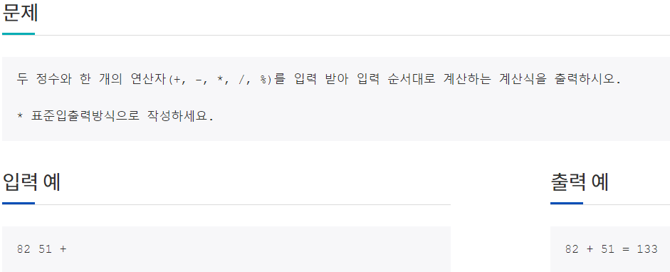 #include <iostream> using namespace std; int main() { int a, b; char c; cin >> a >> b >> c; int result = 0; switch (c) { case '+': result = a + b; break; case '-': result = a - b; break; case '*': result = a * b; break; case '/': result = a / b; break; case '%': result = a % b; break; } cout << a << ' ' << c << ' ' << b << " = " << result << endl; }208 : 파일입출력 - 형성평가4