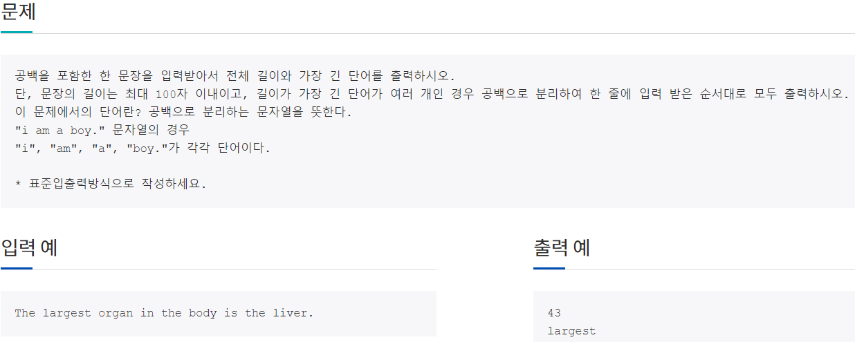 #include <iostream> #include <string> #include <sstream> #include <list> using namespace std; int main() { string str; stringstream sts; getline(cin, str); cout << str.size() << endl; int longest{ 0 }; string word; list<string> longestWordList; for (stringstream sts{ str }; sts >> word; ) { if (word.size() == longest) { longestWordList.push_back(word); } else if (word.size() > longest) { longestWordList.clear(); longest = word.size(); longestWordList.push_back(word); } } for (string str : longestWordList) { cout << str << ' '; } cout << endl; }214 : 파일입출력 - 형성평가A