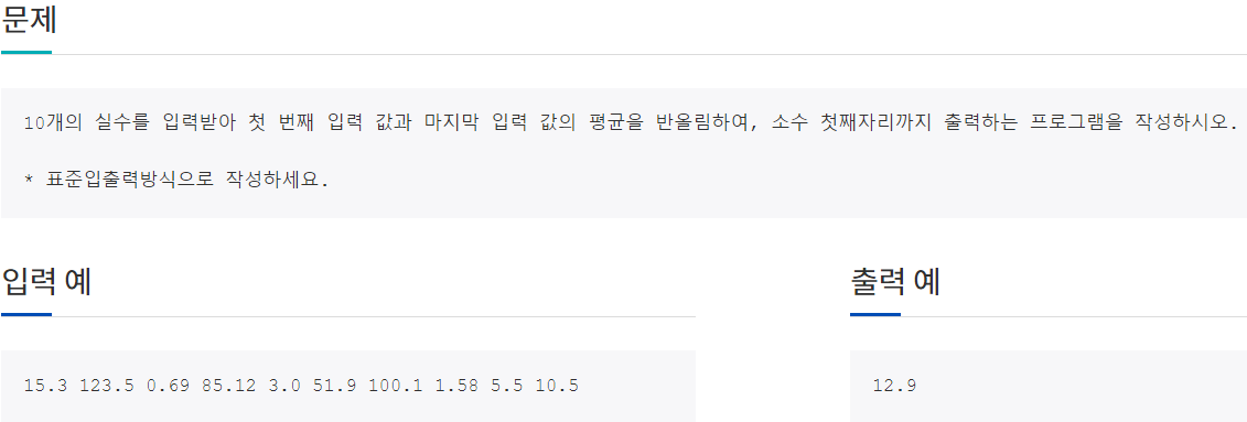 #include <iostream> using namespace std; int main() { float sum = 0; float temp; for (int i = 0; i < 10; ++i) { cin >> temp; if (i == 0 || i == 9) { sum += temp; } } float avg = sum / 2; cout.setf(ios::fixed); cout.precision(1); cout << avg << endl; }628 : 파일입출력 - 자가진단3