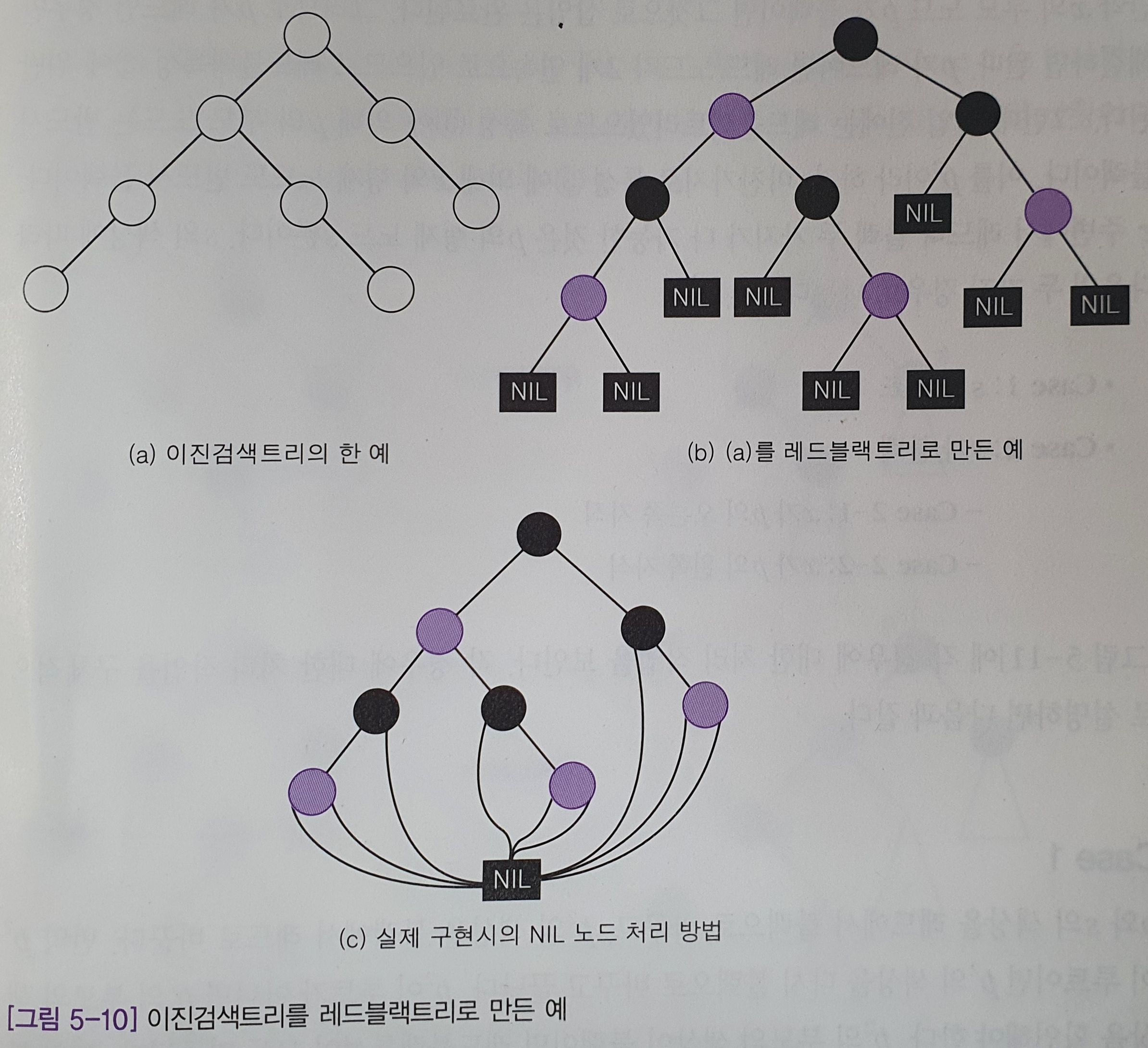 ※ NIL 노드는 하나만 생성한 뒤 리프 노드를 가리킬 때 포인터로 이 NIL노드를 가리키는 것으로 메모리를 절약할 수 있다.