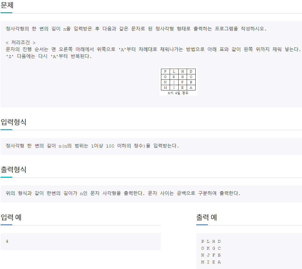 정사각형의 한 변의 길이 n을 입력받은 후 다음과 같은 문자로 된 정사각형 형태로 출력하는 프로그램을 작성하시오. < 처리조건 > 문자의 진행 순서는 맨 오른쪽 아래에서 위쪽으로 'A'부터 차례대로 채워나가는 방법으로 아래 표와 같이 왼쪽 위까지 채워 넣는다. 'Z' 다음에는 다시 'A'부터 반복된다. 정사각형 한 변의 길이 n(n의 범위는 1이상 100 이하의 정수)을 입력받는다. 위의 형식과 같이 한변의 길이가 n인 문자 사각형을 출력한다. 문자 사