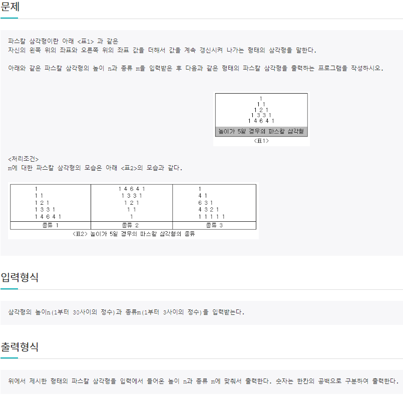 삼각형의 높이n(1부터 30사이의 정수)과 종류m(1부터 3사이의 정수)을 입력받는다. 위에서 제시한 형태의 파스칼 삼각형을 입력에서 들어온 높이 n과 종류 m에 맞춰서 출력한다. 숫자는 한칸의 공백으로 구분하여 출력한다. <생각하기>> 종류 1과 같이 배열에 저장을 한 후 m의 값에 따라 출력을 바꾸면 된다. 종류 2의 경우는 배열의 아래쪽부터 출력을 하면 된다. 종류 3의 경우는 각 위치에 출력되는 배열의 번호를 적어놓고 생각해 보자.