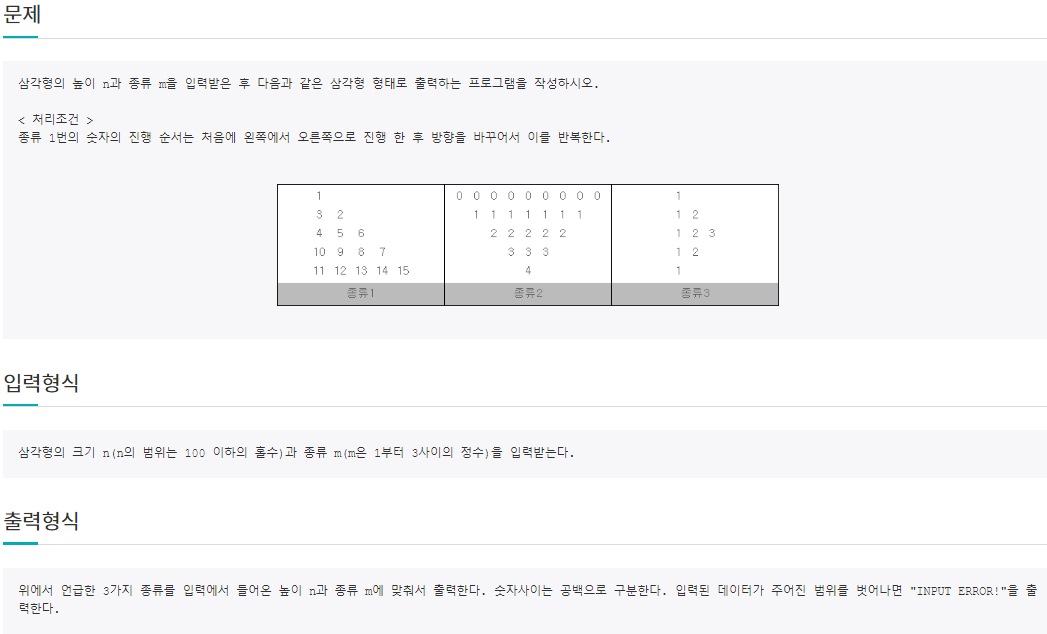#include <iostream> using namespace std; void PrintTriangle1(int n); void PrintTriangle2(int n); void PrintTriangle3(int n); bool CheckInputRange(int n); void PrintError(); int main(void) { int n, m; cin >> n >> m; if (!CheckInputRange(n)) PrintError(); else { switch (m) { case 1: PrintTriangle1(n); break; case 2: PrintTriangle2(n); break; case 3: PrintTriangle3(n); break; default: PrintError(); break; } } } void PrintTriangle1(int n) { int num = 1; for (int i = 1; i <= n; ++i) { if (i % 2 == 1) { for (int j = 1; j <= i; ++j) { cout << num++ << ' '; } num += i; } else { for (int j = 1; j <= i; ++j) { cout << num-- << ' '; } num += i + 1; } cout << endl; } } void PrintTriangle2(int n) { for (int i = 0; i < n; ++i) { for (int j = 0; j < i; ++j) { cout << " "; } for (int j = 0; j < 2 * n - 2 * i - 1; ++j) { cout << i << ' '; } cout << endl; } } void PrintTriangle3(int n) { for (int i = 1; i <= n / 2 + 1; ++i) { for (int j = 1; j <= i; ++j) { cout << j << ' '; } cout << endl; } for (int i = n / 2; i >= 1; --i) { for (int j = 1; j <= i; ++j) { cout << j << ' '; } cout << endl; } } bool CheckInputRange(int n) { if (n < 1) return false; if (n > 100) return false; if (n % 2 == 0) return false; return true; } void PrintError() { cout << "INPUT ERROR!" << endl; }http://www.jungol.co.kr/bbs/board.php?bo_table=pbank&wr_id=914&sca=2020