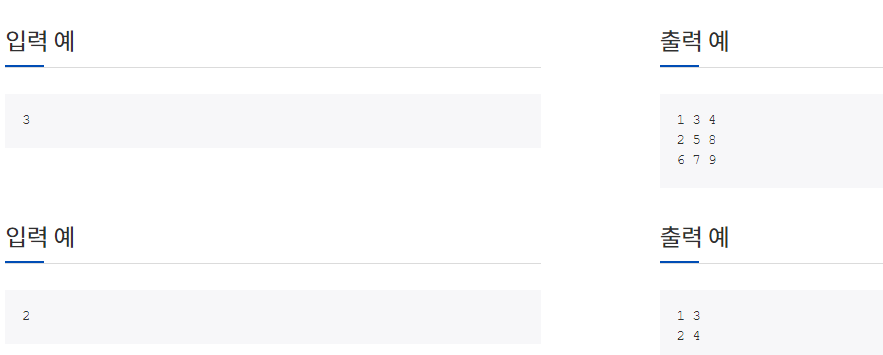 #include <iostream> using namespace std; void MoveLeftDown(int n); void MoveRightUp(int n); enum Direction { LD, RU }; Direction dir{ Direction::LD }; int arr[101][101]; int x{ 0 }, y{ 0 }; int num{ 1 }; int main(void) { int n; cin >> n; for (int i = 0; i < n; ++i) { for (int j = 0; j < n; ++j) { arr[i][j] = -1; } } while (true) { if (dir == Direction::LD) { MoveLeftDown(n); } else { MoveRightUp(n); } if (num > n* n) break; } for (int i = 0; i < n; ++i) { for (int j = 0; j < n; ++j) { cout << arr[i][j] << ' '; } cout << endl; } } void MoveLeftDown(int n) { if (y < n && x >= 0) { arr[y++][x--] = num++; } if (y >= n) { y--; x += 2; dir = Direction::RU; } else if (x < 0) { x++; dir = Direction::RU; } } void MoveRightUp(int n) { if (x < n && y >= 0) { arr[y--][x++] = num++; } if (x >= n) { x--; y += 2; dir = Direction::LD; } else if (y < 0) { y++; dir = Direction::LD; } }http://www.jungol.co.kr/bbs/board.php?bo_table=pbank&wr_id=767&sca=2020