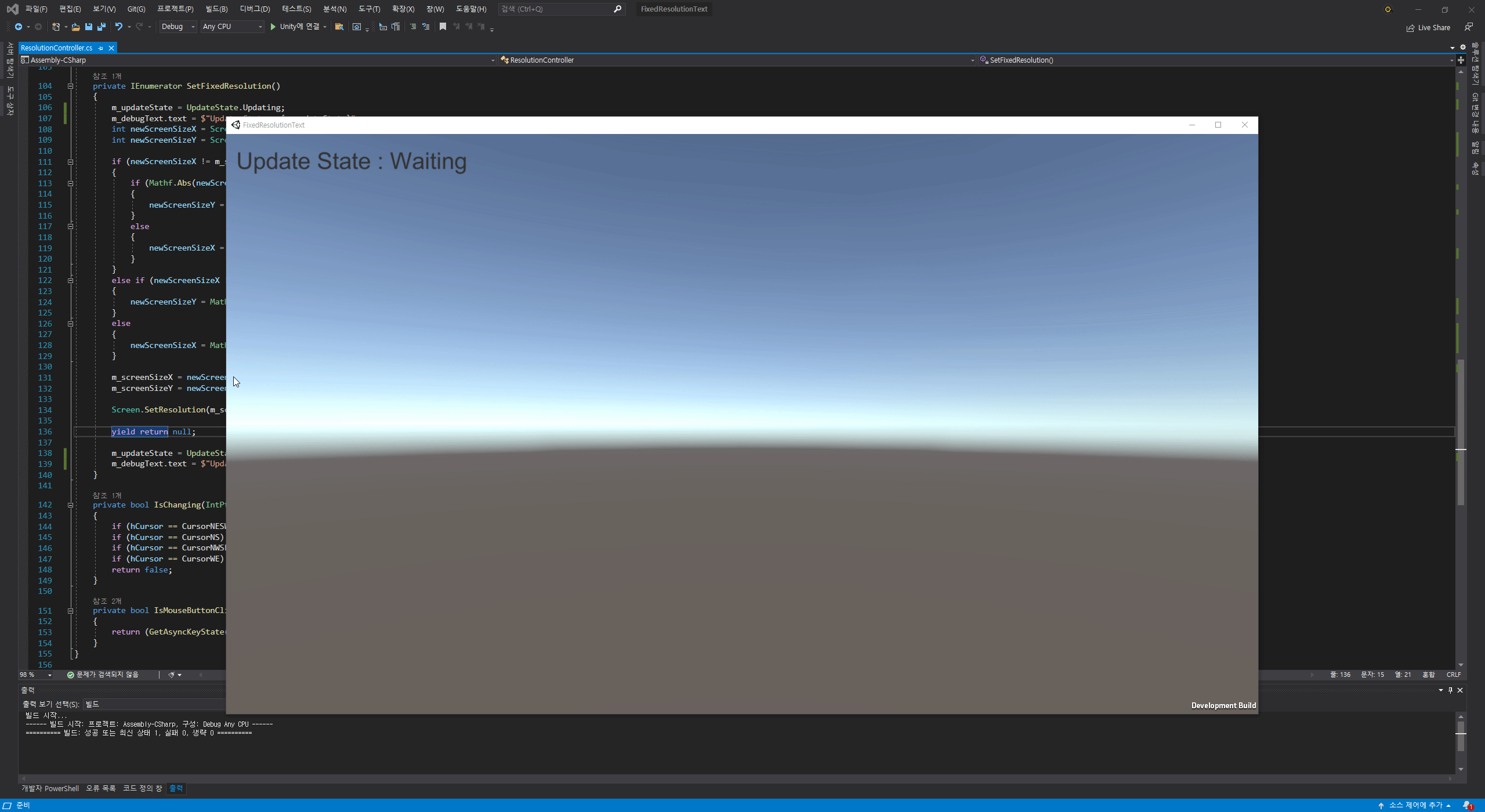 using System; using System.Collections; using System.Runtime.InteropServices; using UnityEngine; using UnityEngine.UI; public class ResolutionController : MonoBehaviour { public float AspectX { get; set; } = 16; public float AspectY { get; set; } = 9; public Text m_debugText; #region ENUMERATIONS private enum Cursors { IDC_ARROW = 32512, IDC_SIZENESW = 32643, IDC_SIZENS = 32645, IDC_SIZENWSE = 32642, IDC_SIZEWE = 32644, } private enum UpdateState { Waiting, Changing, Updating, } #endregion #region WINAPI_DLL [StructLayout(LayoutKind.Sequential)] public struct POINT { public Int32 x; public Int32 y; } private const int VK_LBUTTON = 0x01; private const ushort KEY_HOLD = 0x8000; [DllImport("user32.dll")] private static extern IntPtr GetCursor(); [DllImport("user32.dll")] private static extern IntPtr LoadCursor(IntPtr hInstance, int lpCursorName); [DllImport("user32.dll")] private static extern ushort GetAsyncKeyState(ushort vKey); #endregion #region WINAPI_VARIABLES private IntPtr CursorNESW { get; set; } private IntPtr CursorNS { get; set; } private IntPtr CursorNWSE { get; set; } private IntPtr CursorWE { get; set; } #endregion private float m_aspectRatio; private int m_screenSizeX; private int m_screenSizeY; private UpdateState m_updateState; private void Start() { m_aspectRatio = AspectX / AspectY; m_screenSizeX = Screen.width; m_screenSizeY = Screen.height; Initialize(); } private void Initialize() { CursorNESW = LoadCursor(IntPtr.Zero, (int)Cursors.IDC_SIZENESW); CursorNS = LoadCursor(IntPtr.Zero, (int)Cursors.IDC_SIZENS); CursorNWSE = LoadCursor(IntPtr.Zero, (int)Cursors.IDC_SIZENWSE); CursorWE = LoadCursor(IntPtr.Zero, (int)Cursors.IDC_SIZEWE); m_updateState = UpdateState.Waiting; m_debugText.text = $"Update State : {m_updateState}"; } private void Update() { IntPtr hCursor = GetCursor(); if (m_updateState == UpdateState.Waiting && IsChanging(hCursor) && IsMouseButtonClicked()) { m_updateState = UpdateState.Changing; m_debugText.text = $"Update State : {m_updateState}"; } else if(m_updateState == UpdateState.Changing && !IsMouseButtonClicked()) { StartCoroutine(SetFixedResolution()); } } private IEnumerator SetFixedResolution() { m_updateState = UpdateState.Updating; m_debugText.text = $"Update State : {m_updateState}"; int newScreenSizeX = Screen.width; int newScreenSizeY = Screen.height; if (newScreenSizeX != m_screenSizeX && newScreenSizeY != m_screenSizeY) { if (Mathf.Abs(newScreenSizeX - m_screenSizeX) > Mathf.Abs(newScreenSizeY - m_screenSizeY)) { newScreenSizeY = Mathf.FloorToInt(newScreenSizeX / m_aspectRatio); } else { newScreenSizeX = Mathf.FloorToInt(newScreenSizeY * m_aspectRatio); } } else if (newScreenSizeX != m_screenSizeX) { newScreenSizeY = Mathf.FloorToInt(newScreenSizeX / m_aspectRatio); } else { newScreenSizeX = Mathf.FloorToInt(newScreenSizeY * m_aspectRatio); } m_screenSizeX = newScreenSizeX; m_screenSizeY = newScreenSizeY; Screen.SetResolution(m_screenSizeX, m_screenSizeY, false); yield return null; m_updateState = UpdateState.Waiting; m_debugText.text = $"Update State : {m_updateState}"; } private bool IsChanging(IntPtr hCursor) { if (hCursor == CursorNESW) return true; if (hCursor == CursorNS) return true; if (hCursor == CursorNWSE) return true; if (hCursor == CursorWE) return true; return false; } private bool IsMouseButtonClicked() { return (GetAsyncKeyState(VK_LBUTTON) & KEY_HOLD) != 0; } }빌드 후 실행 결과는 다음과 같다.