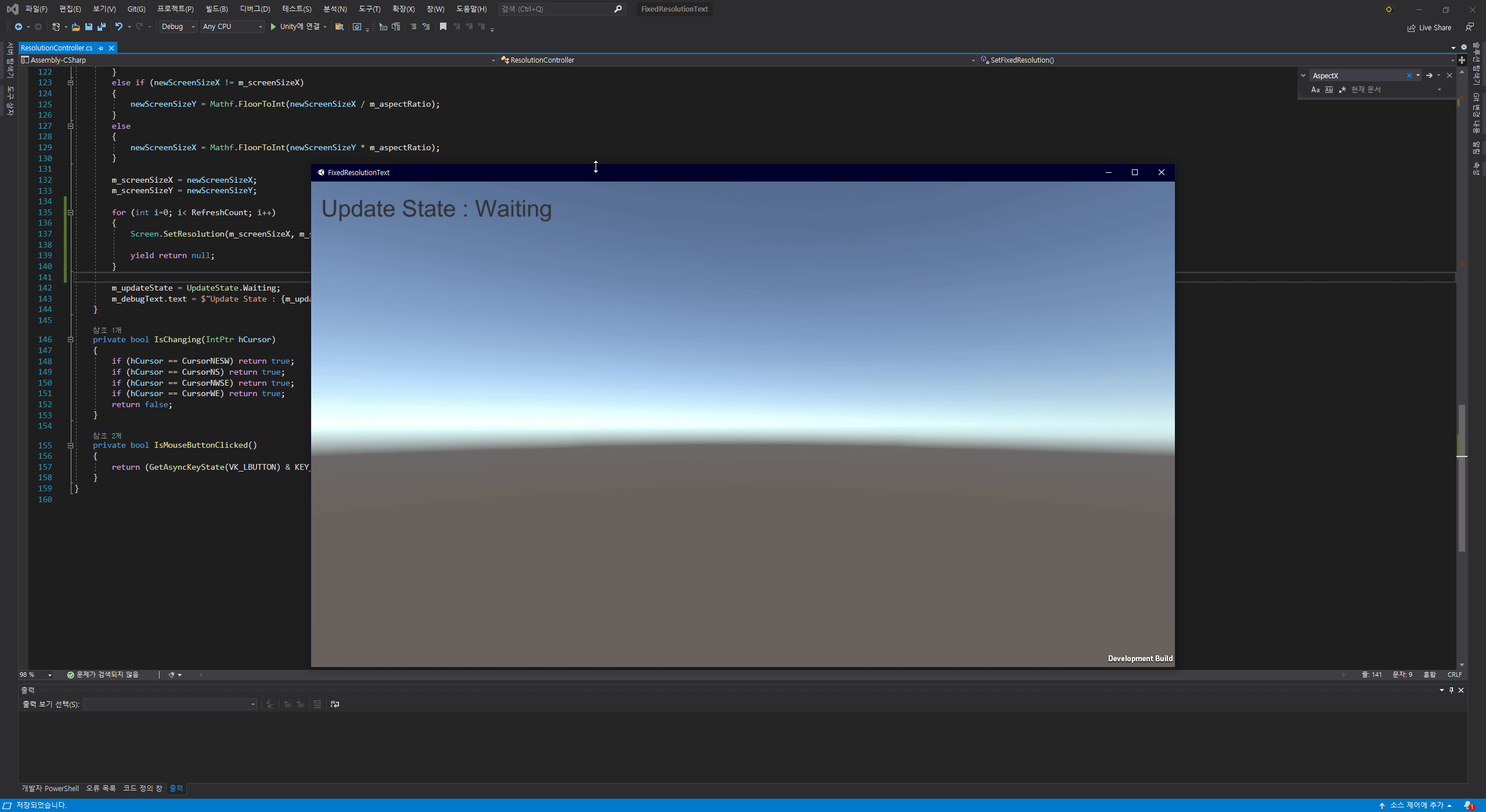 public class ResolutionController : MonoBehaviour { // ... public int RefreshCount { get; set; } = 3; // ... private IEnumerator SetFixedResolution() { // ... for (int i=0; i< RefreshCount; i++) { Screen.SetResolution(m_screenSizeX, m_screenSizeY, false); yield return null; } // ... } // ... }실행 결과는 다음과 같다.
