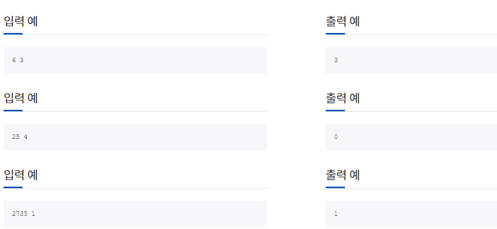 어떤 자연수 p와 q가 있을 때, 만일 p를 q로 나누었을 때 나머지가 0이면 q는 p의 약수이다. 6을 예로 들면 6 ÷ 1 = 6 … 0 6 ÷ 2 = 3 … 0 6 ÷ 3 = 2 … 0 6 ÷ 4 = 1 … 2 6 ÷ 5 = 1 … 1 6 ÷ 6 = 1 … 0 그래서 6의 약수는 1, 2, 3, 6, 총 네 개이다. 두 개의 자연수 N과 K가 주어졌을 때, N의 약수들 중 K번째로 작은 수를 출력하는 프로그램을 작성하시오. 첫째 줄에 N과 K가 빈칸