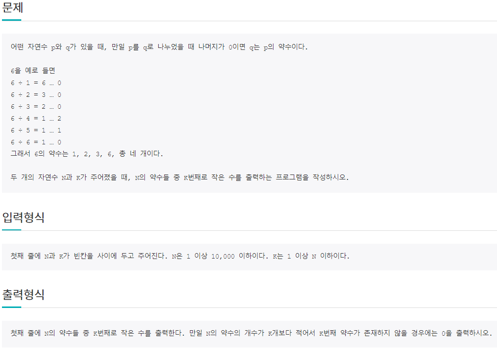 #include <iostream> using namespace std; int main(void) { int n, k; cin >> n >> k; int factorCount{ 0 }, resultFactor{ 0 }; for (int i = 1; i <= n; ++i) { if (n % i == 0) { factorCount++; if (factorCount == k) { resultFactor = i; break; } } } cout << resultFactor << endl; }http://www.jungol.co.kr/bbs/board.php?bo_table=pbank&wr_id=678&sca=2030