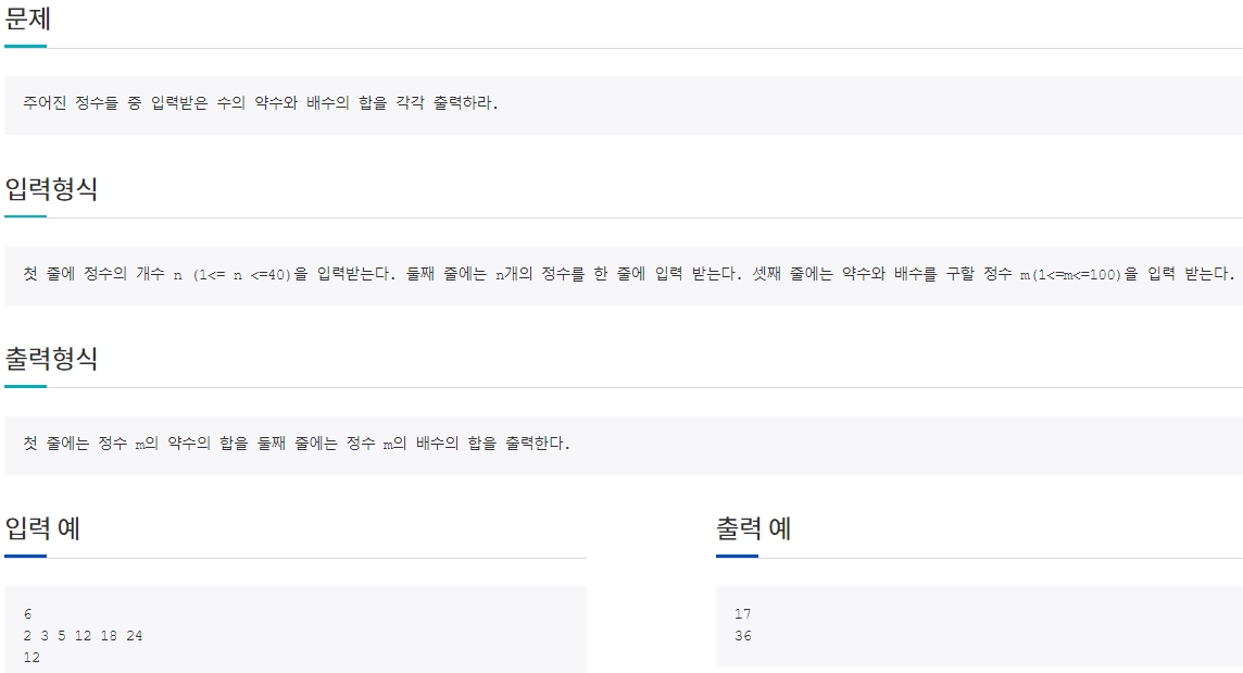 문제의 설명에 많은 부분이 생략되었는데 다시 문제를 쓰자면 n 개의 정수가 주어지고 미지수 m이 주어질 때 해당 정수 리스트에서 m의 약수의 합과 m의 배수의 합을 출력하는 문제입니다.