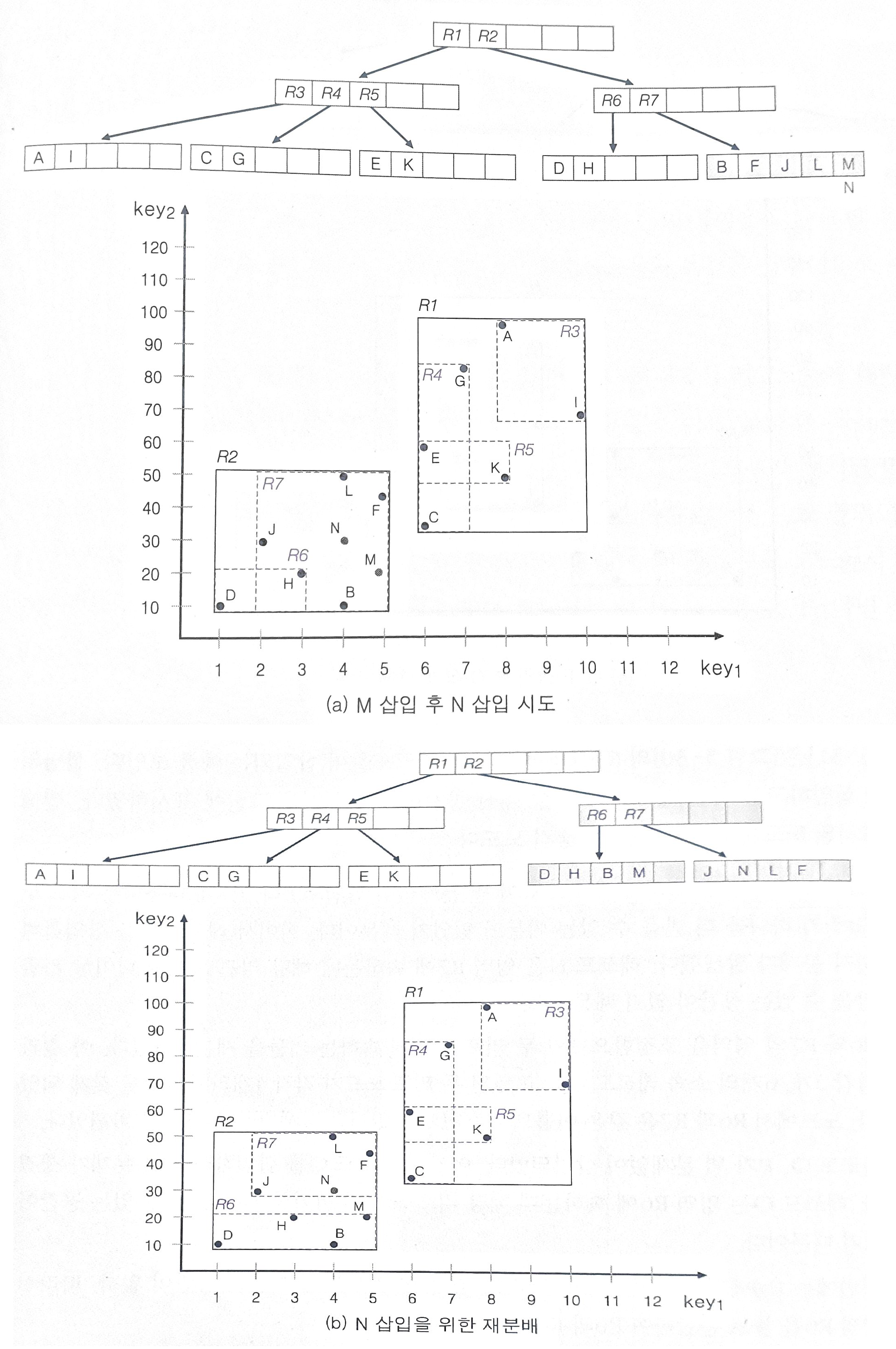 가령 그림 5-30의 데이터에 M과 N을 순서대로 삽입하게 된다면 트리의 영역은 다음과 같이 변하게 된다.
