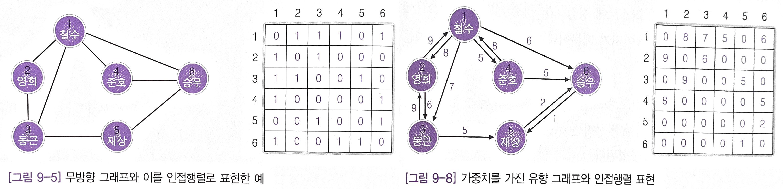 쉽게 배우는 알고리즘 그래프 그림 9-5, 9-8 ※ 간선의 밀도가 아주 높은 그래프의 경우 인접 행렬 표현이 적합하다.