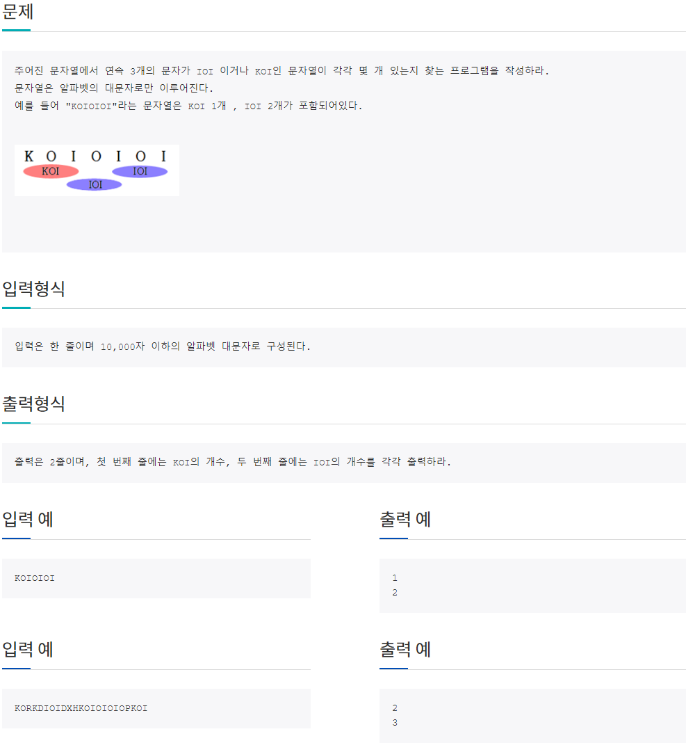 #include <iostream> #include <string> using namespace std; int main(void) { string str; cin >> str; string targets[2]{ "KOI", "IOI" }; for (int i = 0; i < 2; ++i) { int index{ 0 }; int cnt{ 0 }; while (true) { index = str.find(targets[i], index); if (index == -1) break; index++; // 다음에 찾을 때 이미 찾은거 포함 안하기 cnt++; } cout << cnt << endl; } }http://www.jungol.co.kr/bbs/board.php?bo_table=pbank&wr_id=1775&sca=2050