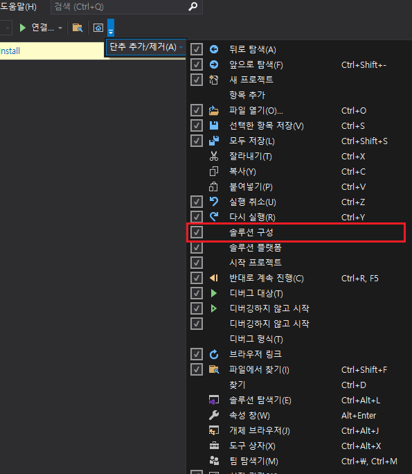 1. 툴바의 우측 버튼 클릭 - 단추 추가/제거(A) 클릭 - 솔루션 구성 체크