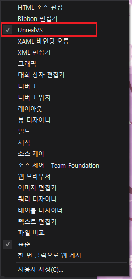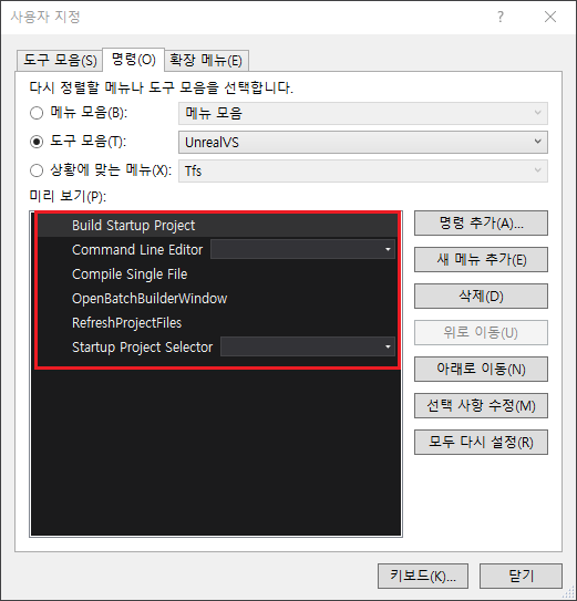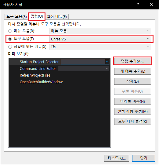1. 툴바 우클릭 - 하단의 사용자 지정(C)... 클릭 - [명령(O)] 탭 클릭 - 도구 모음(T): 선택 - 도구 모음 드롭다운에서 UnrealVS 선택 - 명령 추가(A)... 클릭