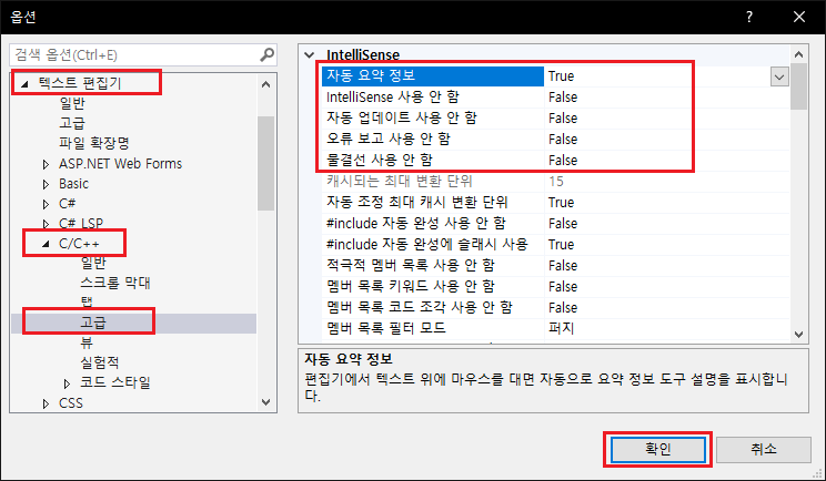4. [도구(T)] 클릭 - [옵션(O)...] 클릭 - 텍스트 편집기 > C/C++ > 고급 클릭 - 자동 요약 정보 True, IltelliSense 사용 안 함 False, 자동 업데이트 사용 안 함 False, 오류 보고 사용 안 함 False, 물결선 사용 안 함 False 적용 후 확인