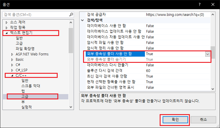2. [도구(T)] 클릭 - [옵션(O)...] 클릭 - 텍스트 편집기 > C/C++ > 고급 클릭 - 외부 종속성 폴더 사용 안 함 True 적용 후 확인
