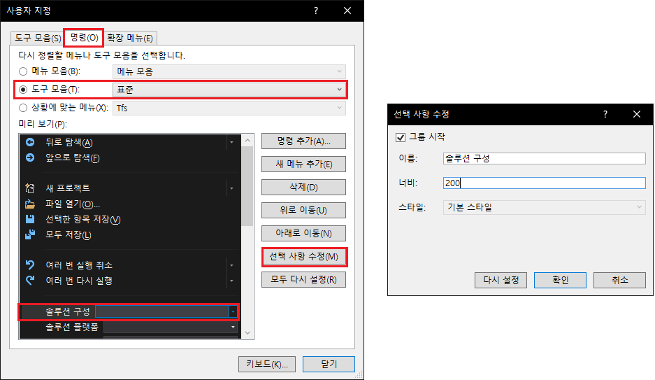 2. 툴바 우클릭 후 하단의 사용자 지정(C)...[명령(O)] 탭 클릭 - 도구 모음(T): 선택 - 도구 모음 드롭다운에서 표준 선택 - 솔루션 구성 선택 - 선택 사항 수정(M) 클릭 - 선택 사항 수정 창에서 너비를 200으로 수정한 뒤 확인