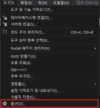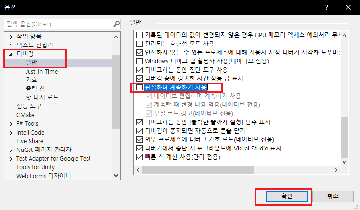 3. 선택 사항! 편집하며 계속하기 기능이 필요 없는 경우 [도구(T)] 클릭 - [옵션(O)...] 클릭 - 디버깅 > 일반 클릭 - 편집하며 계속하기 사용 체크 해제 후 확인