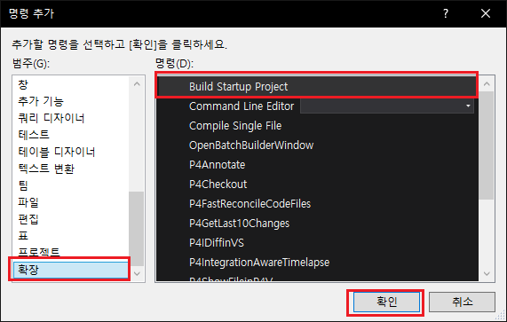2. 범주 리스트에서 확장 클릭 - 명령 리스트에서 Build Startup Project 선택 - 확인 클릭