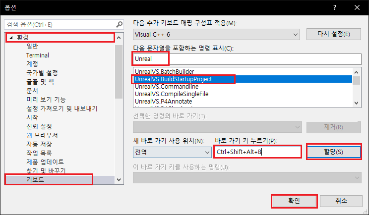 1. [도구(T)] 클릭 - [옵션(O)...] 클릭 - 환경 > 키보드 클릭 - "다음 문자열을 포함하는 명령 표시(C):"에 Unreal 입력 - UnrealVS.BuildStartupProject 클릭 - 바로 가기 키 누르기(P): 클릭 - Ctrl + Shift + Alt + B 키보드 입력 - 할당(S) 클릭 - 확인 클릭