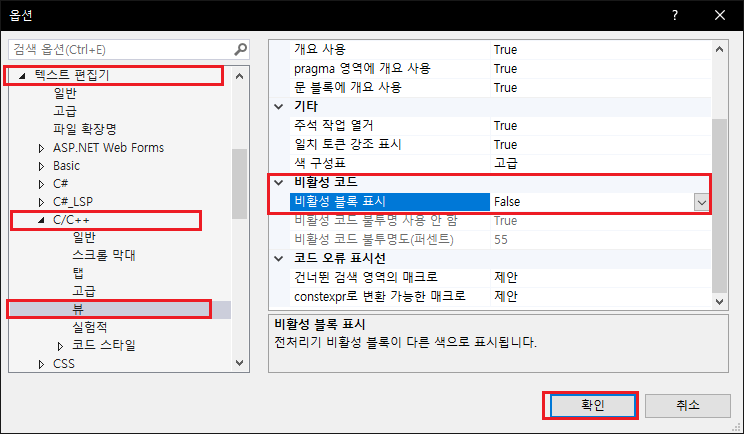 1. [도구(T)] 클릭 - [옵션(O)...] 클릭 - 텍스트 편집기 > C/C++ > 뷰 클릭 - 비활성 블록 표시 False 적용 후 확인