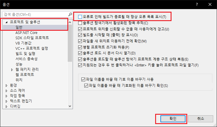 2. 프로젝트 및 솔루션 > 일반 클릭 - "오류로 인해 빌드가 종료될 때 항상 오류 목록 표시(T) 체크 해제 후 확인