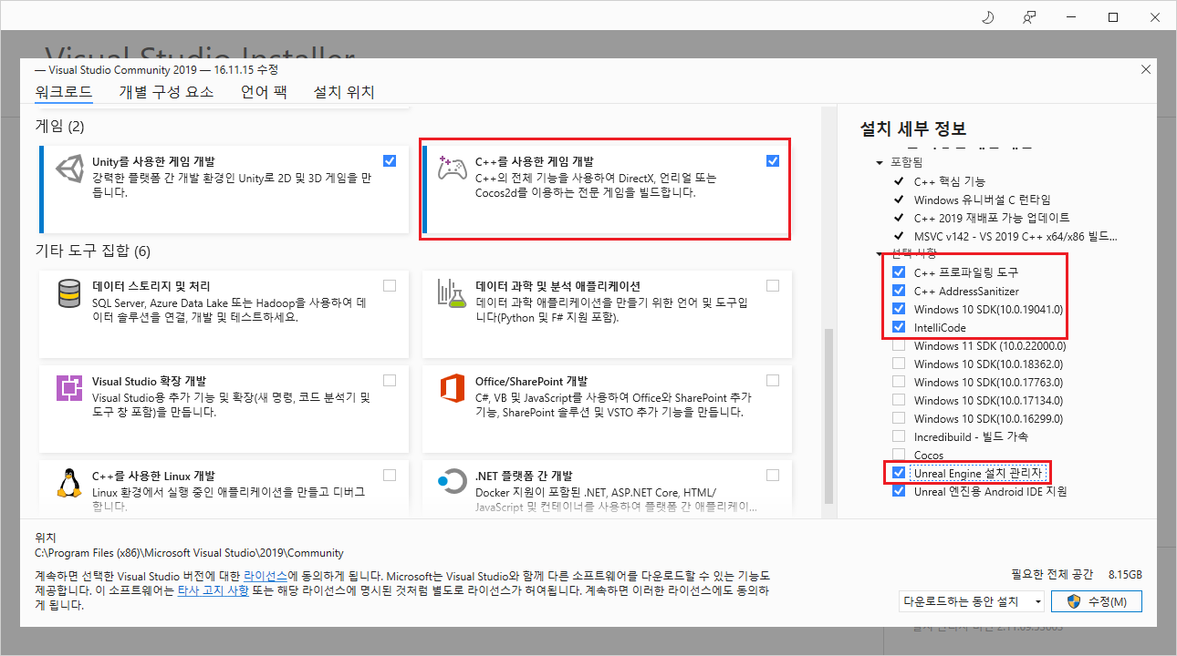 2. 설치 세부 정보 - C++ 프로파일링 도구, C++ AddressSanitizer, Windows 10 SDK, IntelliCode, Unreal Engine 설치 관리자 체크 후 설치