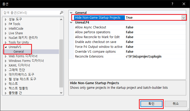 2. 선택 사항! Game 프로젝트만 사용하는 경우 [도구(T)] 클릭 - [옵션(O)...] 클릭 - UnrealVS > General 클릭 - Hide Non-Game Startup Projects True 적용 후 확인