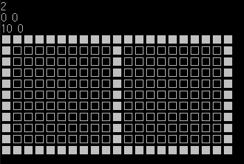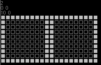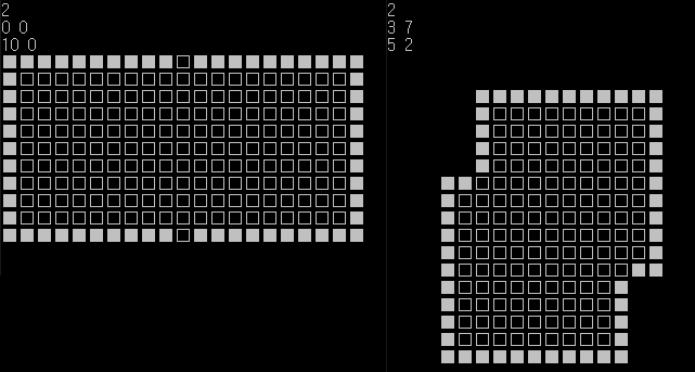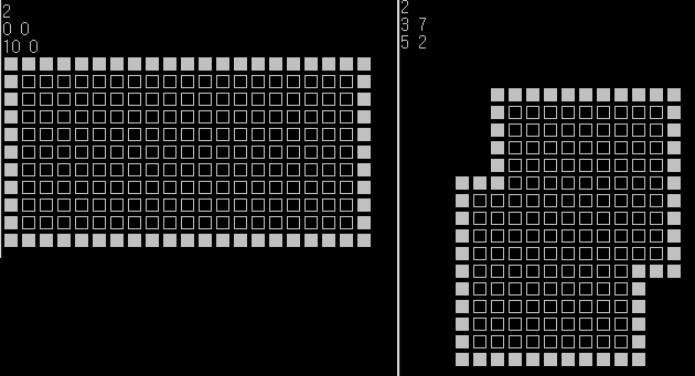 #include <iostream> using namespace std; bool IsEdge(int x, int y, int px, int py); bool IsVertex(int x, int y, int px, int py); enum areaType{ empty = 0, face, edge }; areaType area[102][102]{}; int main(void) { int n; cin >> n; int x, y; for (int i = 0; i < n; ++i) { cin >> x >> y; for (int j = y; j <= y + 10; ++j) { for (int k = x; k <= x + 10; ++k) { if (IsEdge(x, y, k, j)) { if(area[j][k] != areaType::face) { area[j][k] = areaType::edge; } } else { area[j][k] = areaType::face; } } } } for (int v = 0; v < 101; ++v) { for (int w = 0; w < 101; ++w) { if (area[v][w] == areaType::edge) { cout << "■"; } else if (area[v][w] == areaType::face) { cout << "□"; } else { cout << " "; } } cout << endl; } int totalArea{ 0 }; for (int i = 0; i < 101; ++i) { for (int j = 0; j < 101; ++j) { if (area[i][j] == areaType::edge) { if (area[i + 1][j] == areaType::edge) { totalArea++; } if (area[i][j + 1] == areaType::edge) { totalArea++; } } } } cout << totalArea << endl; } bool IsEdge(int x, int y, int px, int py) { if (px == x) return true; if (px == x + 10) return true; if (py == y) return true; if (py == y + 10) return true; return false; } bool IsVertex(int x, int y, int px, int py) { if (px == x && py == y) return true; if (px == x + 10 && py == y) return true; if (px == x && py == y + 10) return true; if (px == x + 10 && py == y + 10) return true; return false; }그런데 여기에서 어색한 부분을 찾을 수 있는데, 바로 두 상자가 겹치면서 중간에 선이 남게 되는 것 입니다.