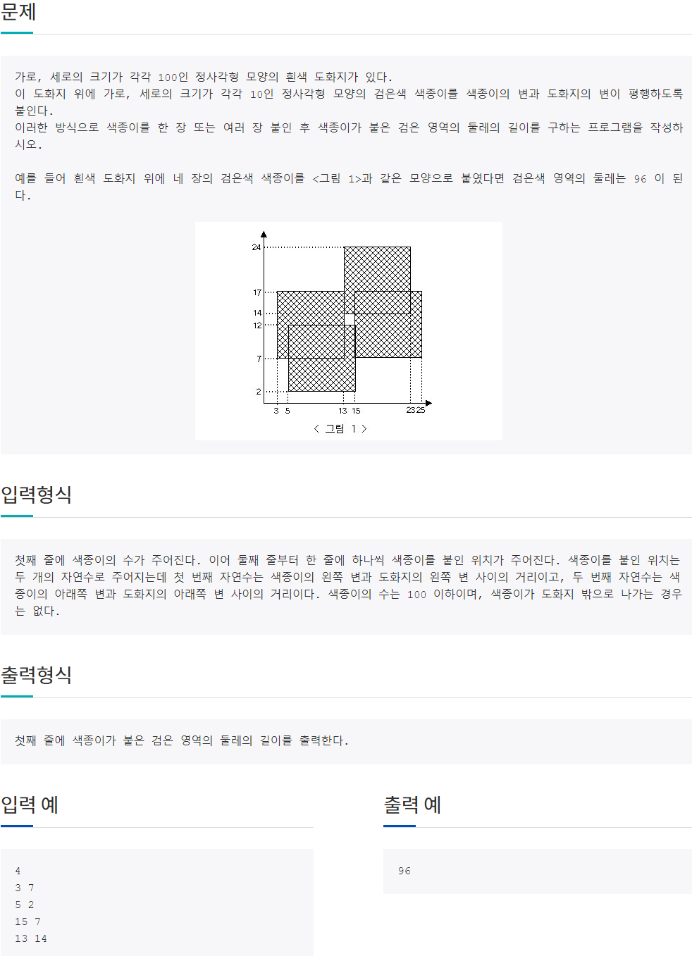 가로, 세로의 크기가 각각 100인 정사각형 모양의 흰색 도화지가 있다. 이 도화지 위에 가로, 세로의 크기가 각각 10인 정사각형 모양의 검은색 색종이를 색종이의 변과 도화지의 변이 평행하도록 붙인다. 이러한 방식으로 색종이를 한 장 또는 여러 장 붙인 후 색종이가 붙은 검은 영역의 둘레의 길이를 구하는 프로그램을 작성하시오. 예를 들어 흰색 도화지 위에 네 장의 검은색 색종이를 <그림 1>과 같은 모양으로 붙였다면 검은색 영역의 둘레는 96 이 된다