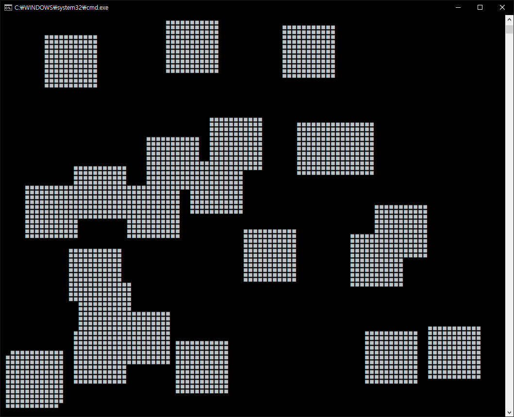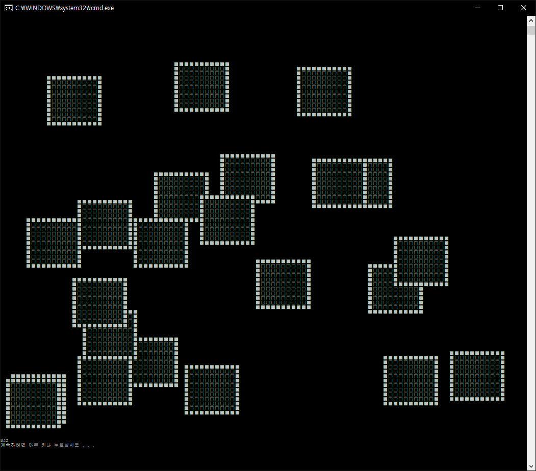 for (int i = 0; i < n; ++i) { cin >> x >> y; for (int j = y; j <= y + 10; ++j) { for (int k = x; k <= x + 10; ++k) { if (IsEdge(x, y, k, j)) { // 코드 추가 if (area[j][k] == areaType::edge) { area[j][k] = areaType::face; } if(area[j][k] != areaType::face) { area[j][k] = areaType::edge; } } else { area[j][k] = areaType::face; } } } }이 코드로 실행한 결과는 다음과 같습니다.