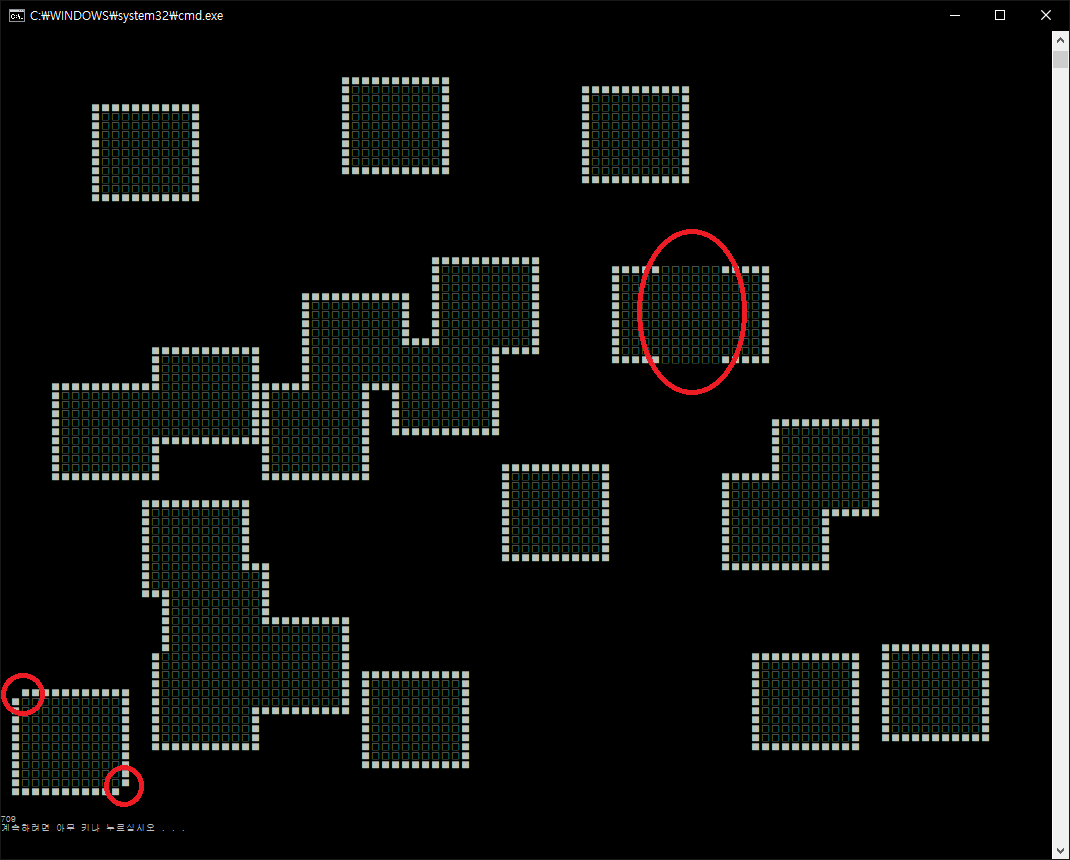 int main(void) { // ... 중략 for (int i = 0; i <= 100; ++i) { for (int j = 0; j <= 100; ++j) { if (IsVertex(j, i)) { area[i][j] = areaType::edge; } } } // ... 후략 } // ... bool IsVertex(int px, int py) { if (area[py][px] != areaType::face) return false; // 대각선 체크 if (px > 0 && py > 0 && area[py - 1][px - 1] == areaType::edge) return false; if (px > 0 && py < 100 && area[py + 1][px - 1] == areaType::edge) return false; if (px < 100 && py > 0 && area[py - 1][px + 1] == areaType::edge) return false; if (px < 100 && py < 100 && area[py + 1][px + 1] == areaType::edge) return false; // 상하좌우 체크 int crossCount{ 0 }; if (px > 0 && area[py][px - 1] == areaType::edge) crossCount++; if (px < 100 && area[py][px + 1] == areaType::edge) crossCount++; if (py > 0 && area[py - 1][px] == areaType::edge) crossCount++; if (py < 100 && area[py + 1][px] == areaType::edge) crossCount++; return crossCount >= 2; }이 코드의 실행 결과는 다음과 같습니다.