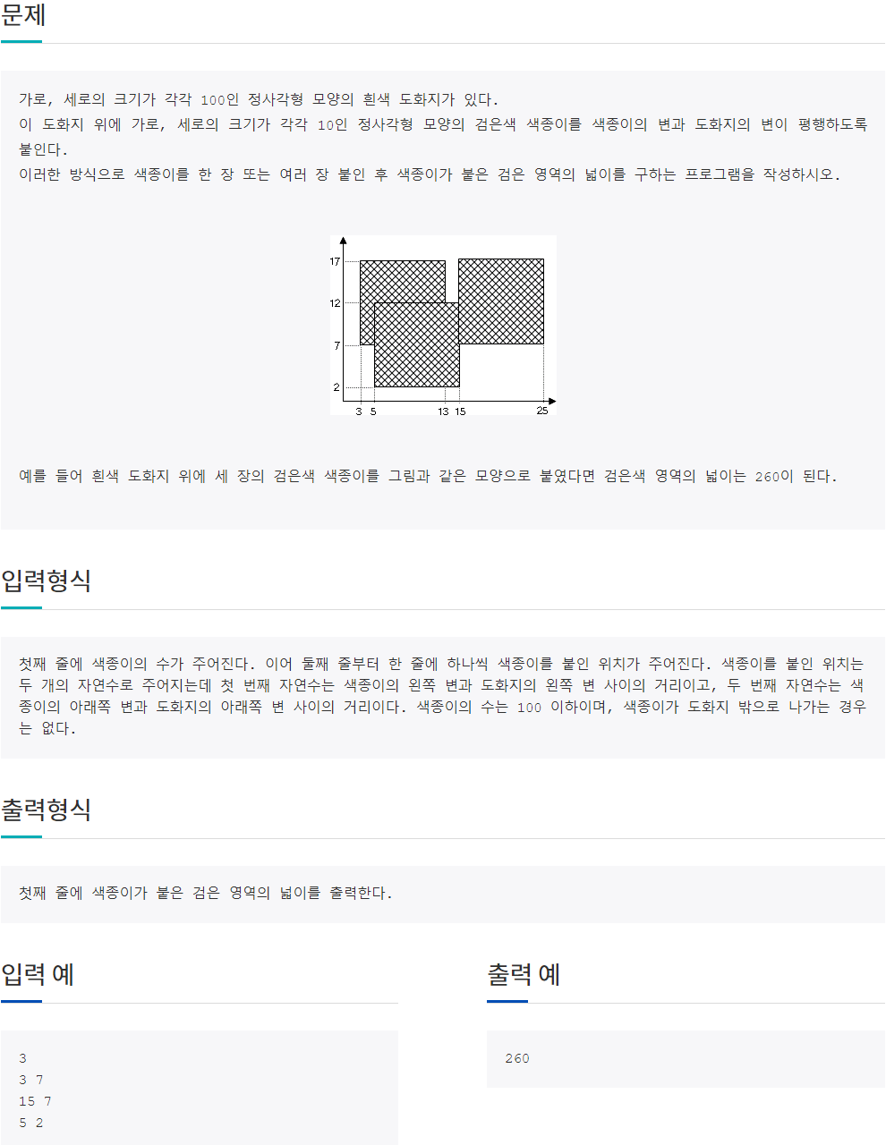 가로, 세로의 크기가 각각 100인 정사각형 모양의 흰색 도화지가 있다. 이 도화지 위에 가로, 세로의 크기가 각각 10인 정사각형 모양의 검은색 색종이를 색종이의 변과 도화지의 변이 평행하도록 붙인다. 이러한 방식으로 색종이를 한 장 또는 여러 장 붙인 후 색종이가 붙은 검은 영역의 넓이를 구하는 프로그램을 작성하시오. 예를 들어 흰색 도화지 위에 세 장의 검은색 색종이를 그림과 같은 모양으로 붙였다면 검은색 영역의 넓이는 260이 된다. 첫째 줄에