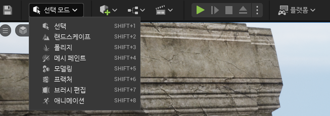 기본적으로 선택 모드를 사용하게 되며, 다른 모드에 설정이 존재하는 경우 좌측에 창이 추가로 나타나게 된다.