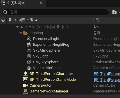 레벨의 아웃라이너에는 레벨에 배치된 액터를 확인할 수 있는데, 흰색으로 표시된 액터는 미리 배치된 액터를 뜻하고 노란색으로 표시되는 액터는 새롭게 추가된 액터를 뜻한다.