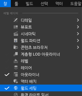 이 외의 정보는 월드 세팅에서 확인할 수 있는데, UE 5.0에서는 [창] - [월드 세팅] 버튼을 눌러 월드 세팅 창을 열 수 있다.