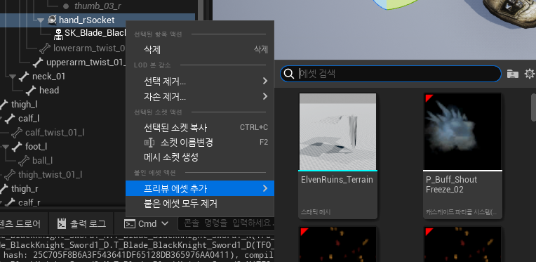이것은 스켈레톤 메쉬에서 설정할 수 있으며 프리뷰 에셋을 이용해 자신이 사용하고자 하는 에셋의 위치를 적절하게 설정할 수 있다.