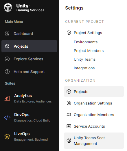 Dashboard 접속 이후 사이트 메뉴에서 Projects - Unity Teams Seat Management에 들어가면 프로젝트 별로 시트(수량)를 관리하는 창으로 넘어가게 된다.