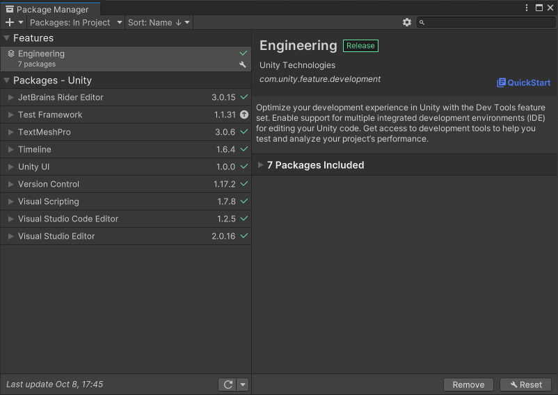 패키지 매니저 실행 패키지 매니저에서는 현재 프로젝트에 로드 되어있는 패키지를 바로 확인해서 업데이트, 제거를 할 수 있다.