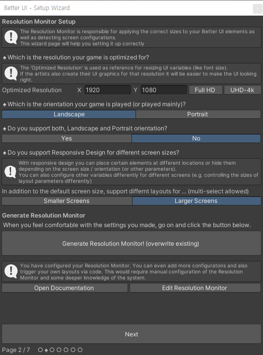 옵션을 선택한 후 [Generate Resolution Monitor!] 버튼을 누르면 해당 정보를 활용할 수 있는 Resolution Monitor라는 애셋이 생성되게 된다. 이때, 해당 애셋을 직접 클릭해 열거나 [Edit Resolution Monitor] 버튼을 누르면 인스펙터 창에서 설정한 옵션을 변경하거나 추가적인 옵션을 설정할 수 있다.