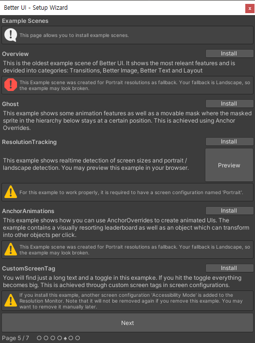 다음으로 넘어가면 각종 예제와 이 애셋 개발자가 설정해둔 기본 스크립트, 태그 등을 설치할 수 있다.