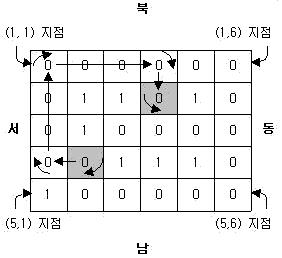 - dir 은 left 또는 right 이며 각각 왼쪽 또는 오른쪽으로 90° 회전한다.공장 내 궤도가 설치되어 있는 상태가 아래와 같이 0과 1로 이루어진 직사각형 모양으로 로봇에게 입력된다.