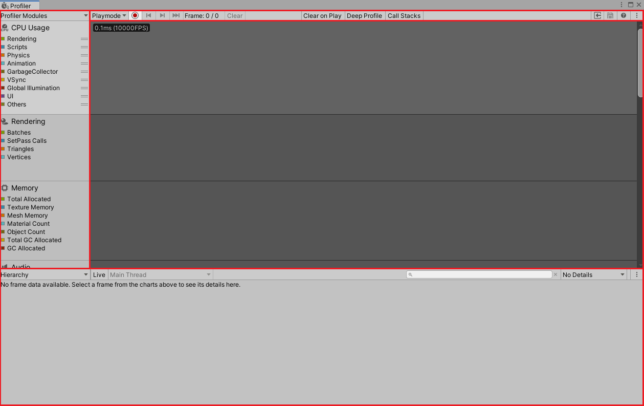 유니티 프로파일러 창은 다음과 같이 크게 네 부분으로 구분할 수 있다.