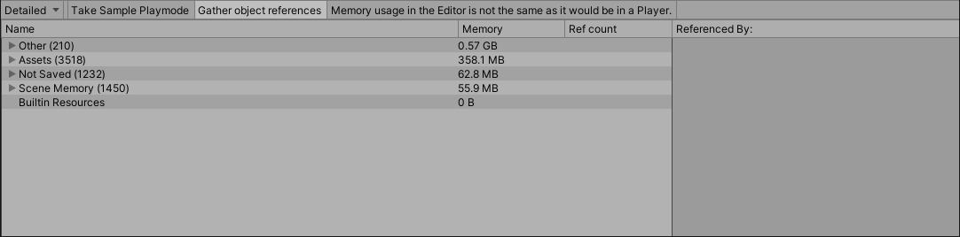 - Detailed 모드 메모리에 올라가 있는 에셋을 다섯 가지 분류로 나눠 계층적으로 표시한다. 개별 에셋의 용량과 참조 카운트, 어떤 개체에 의해 참조되고 있는지 등을 확인할 수 있다.