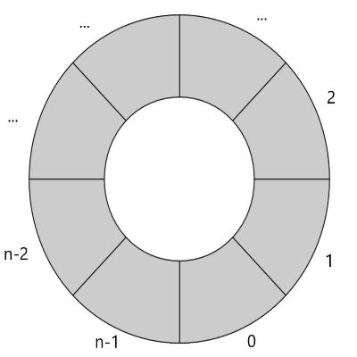 원형 큐는 기본적으로 시작 지점과 끝 지점을 연결해 계속해서 이어질 수 있도록 만든 것으로 논리적 구조는 다음과 같다.