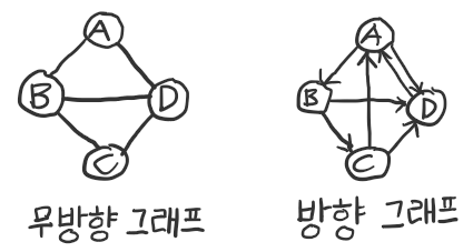 - V(방향 그래프) = { A, B, C, D } E(방향 그래프) = { <A, B>, <A, D>, <B, C>, <B, D>, <C, A>, <C, D>, <D, A> }