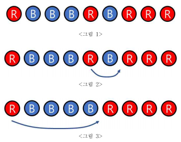 빨간색 볼과 파란색 볼이 <그림 1>에서 보인 것처럼 일직선상에 섞여 놓여 있을때,