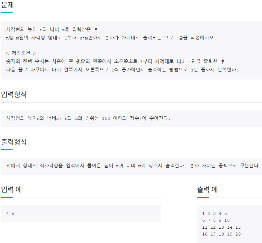 사각형의 높이n와 너비m( n과 m의 범위는 100 이하의 정수)이 주어진다. 위에서 형태의 직사각형을 입력에서 들어온 높이 n과 너비 m에 맞춰서 출력한다. 숫자 사이는 공백으로 구분한다. <알아두기> 반복문을 이용한 출력 일반적으로 일정한 수들의 집합을 행렬과 같은 사각형 형태로 출력하려면 반복문을 이용해서 간단하게 처리할 수 있다. <코드> for (i =0; i < n; i++) { for (j = 0; j < m; j++) {